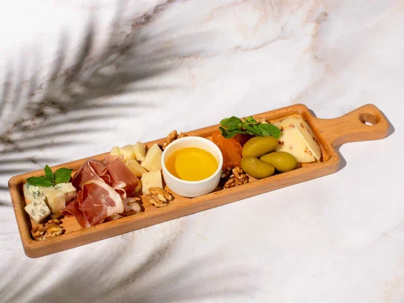 Пармезан, Горгондзола, Качотта с томатом, пармская ветчина, хурма, оливки зеленые с косточкой, грецкий орех, мед, мята