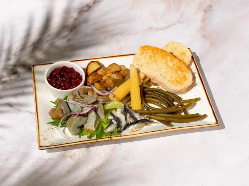 Грузди соленые, битые огурцы, черемша соленая, балтийская килька, мини кукуруза, картофель, мочёная брусника, листья салата, чиабатта