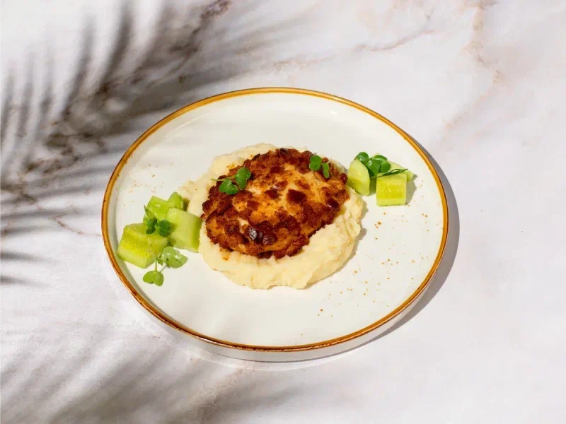 Пожарская котлета с пюре и битыми огурцами